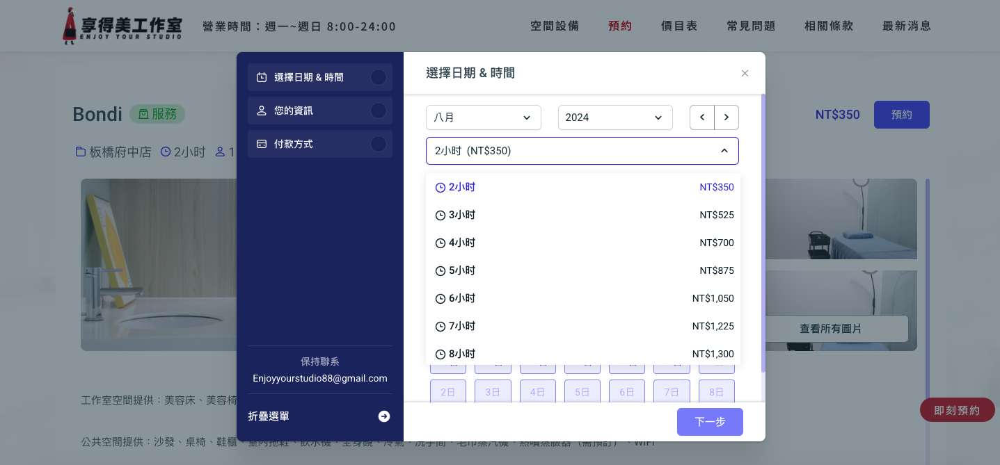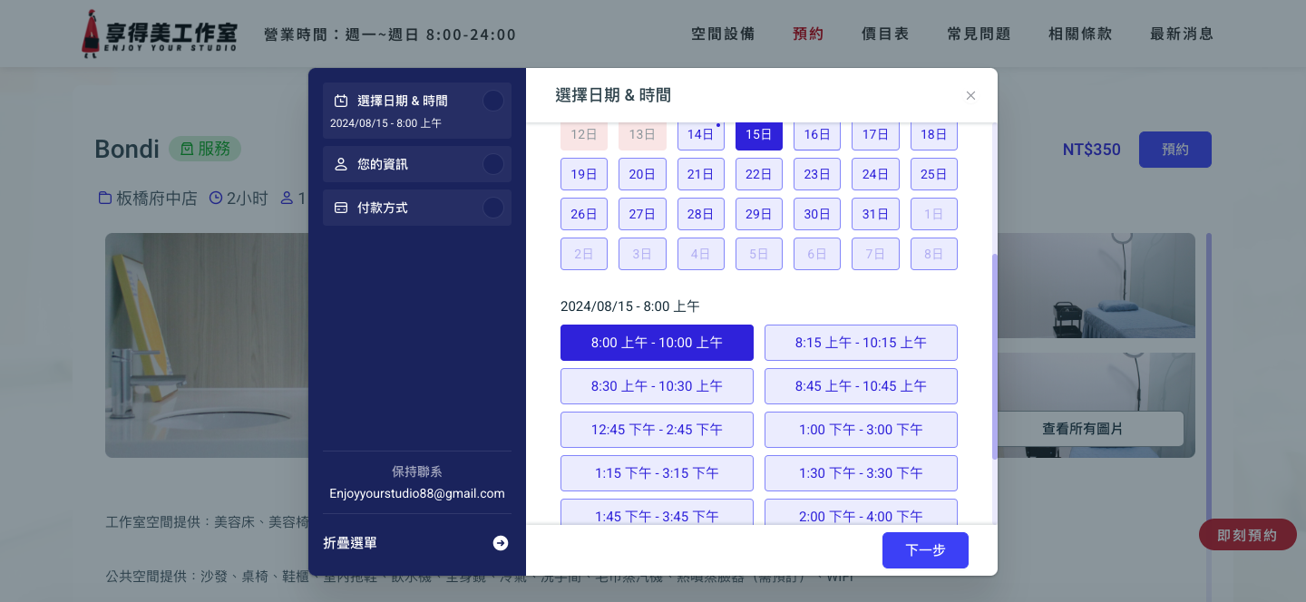 *以8/15 8:00-10:00使用 BONDI房型為例 我們就選8月、15日、2小時、幾點到幾點 最後再按下一步以下附上圖文教學