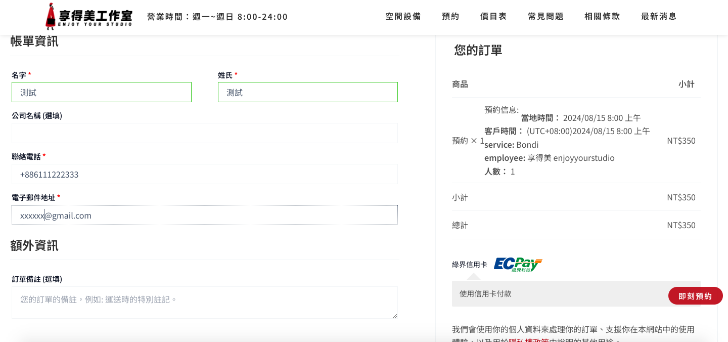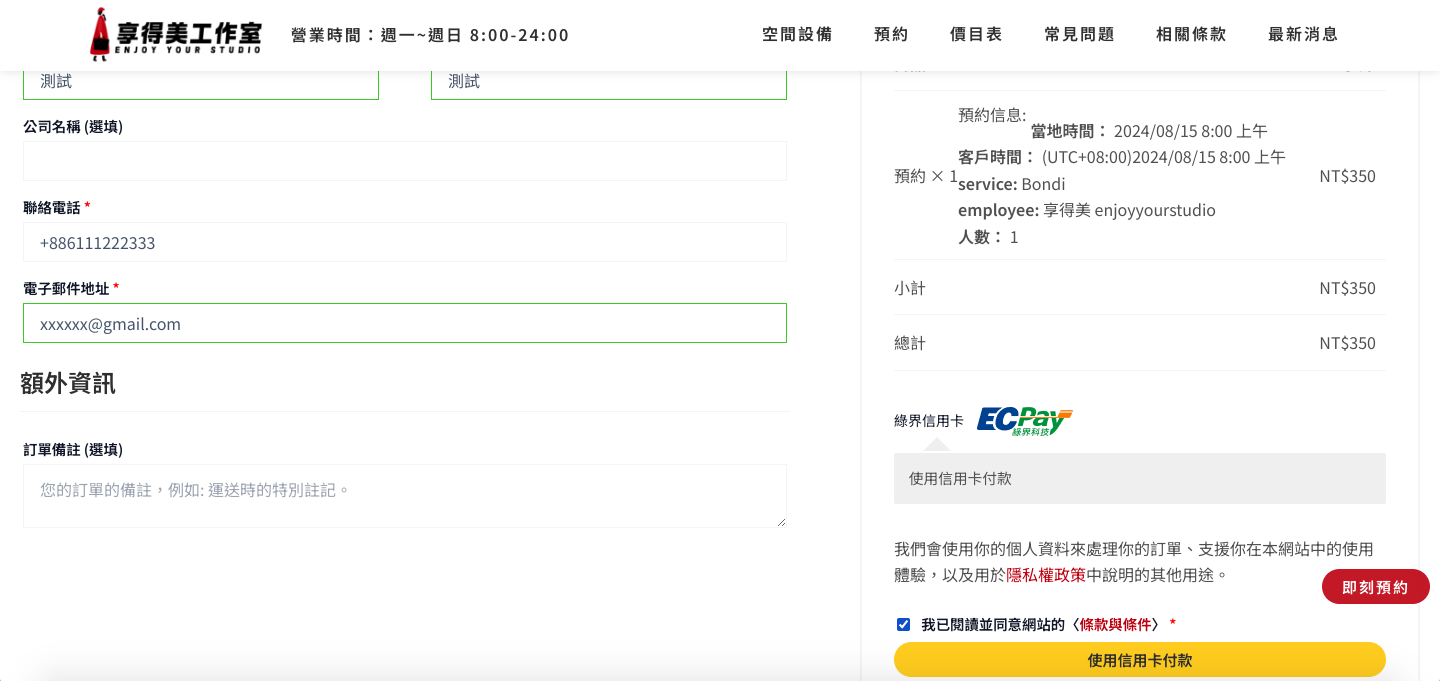 結帳:選信用卡付款、輸入完基本資料後按下立即付款就預訂成功啦!